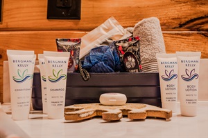 The airy open-plan living area has a smart TV, streaming apps, fast Wi-Fi, and a floor-to-ceiling fireplace. The kitchen is stocked with cookware, spices, and a drip coffee and Keurig with complimentary coffee pods. In the bedroom you’ll find a king mattress, blackout curtains, and hotel-quality linens.