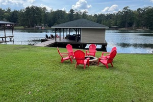 Enjoy sweeping water views from the large lakeside deck or relax on the screened porch with your morning coffee. The level yard leads directly to your private double boathouse with a covered sitting area, perfect for lounging in the shade or enjoying sunset cocktails by the water. The yard also provides plenty of space for the kids to run around, yard games, etc.