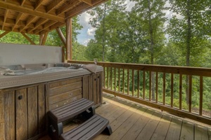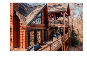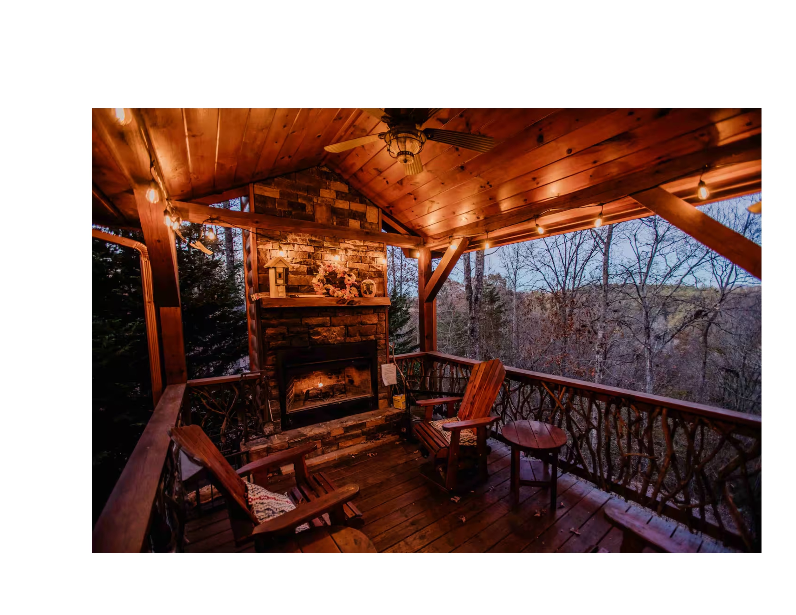 🦉 Step inside our cozy cabin, adorned with custom rustic furniture and a wildlife theme. The main level family room, complete with a stone gas fireplace and 42” TV, beckons you to unwind. Venture outdoors to the covered deck, featuring a stone-faced wood-burning fireplace and a five-seat hot tub with panoramic mountain views.