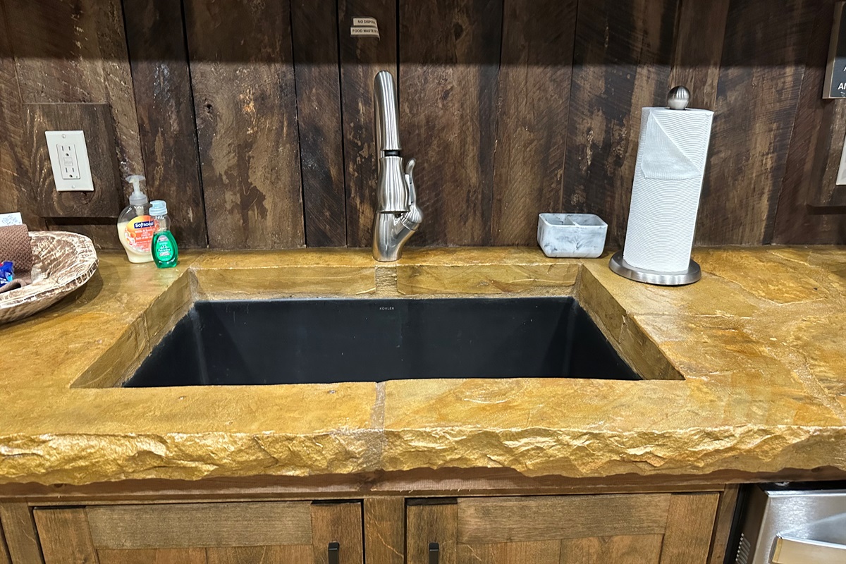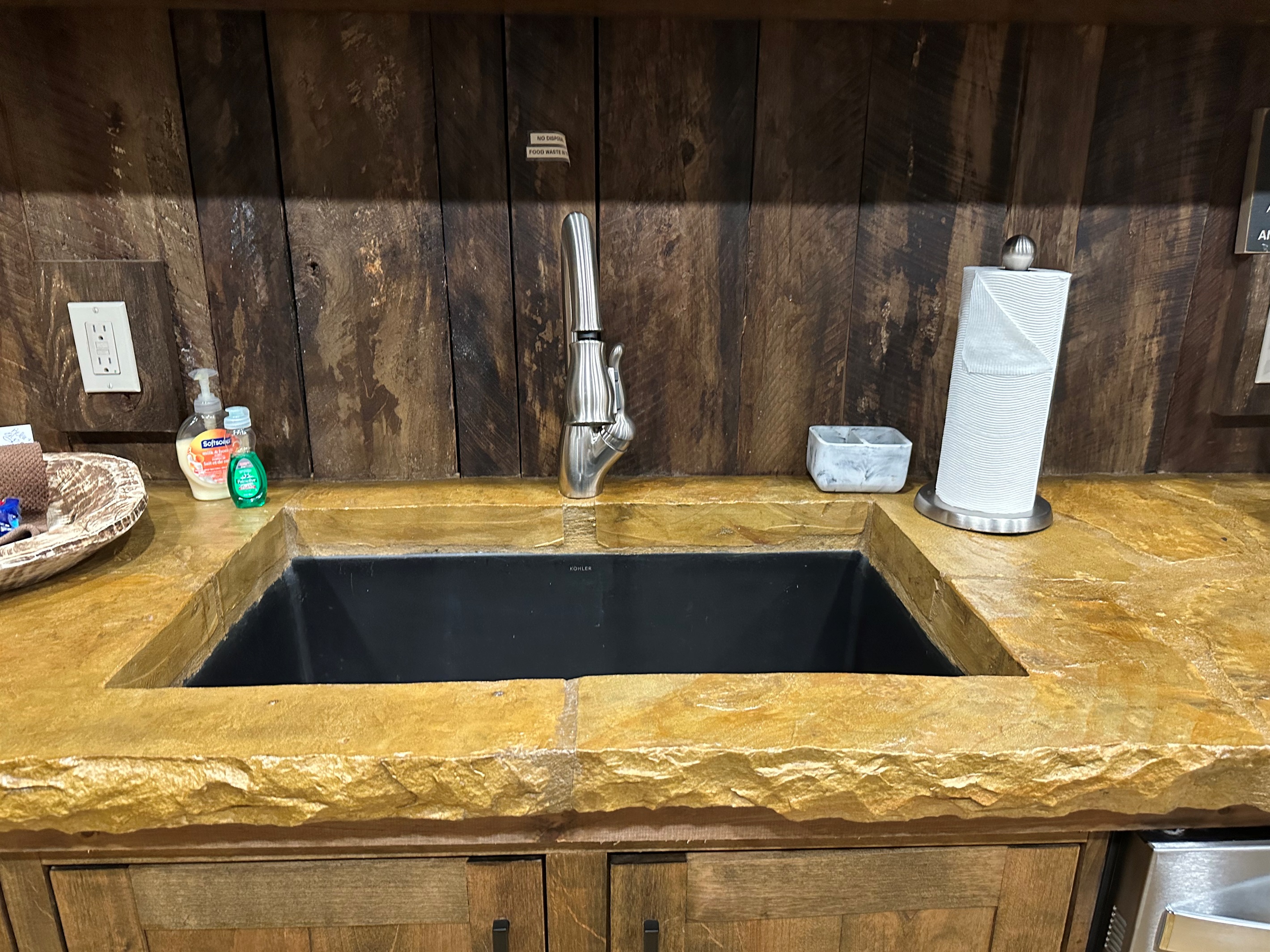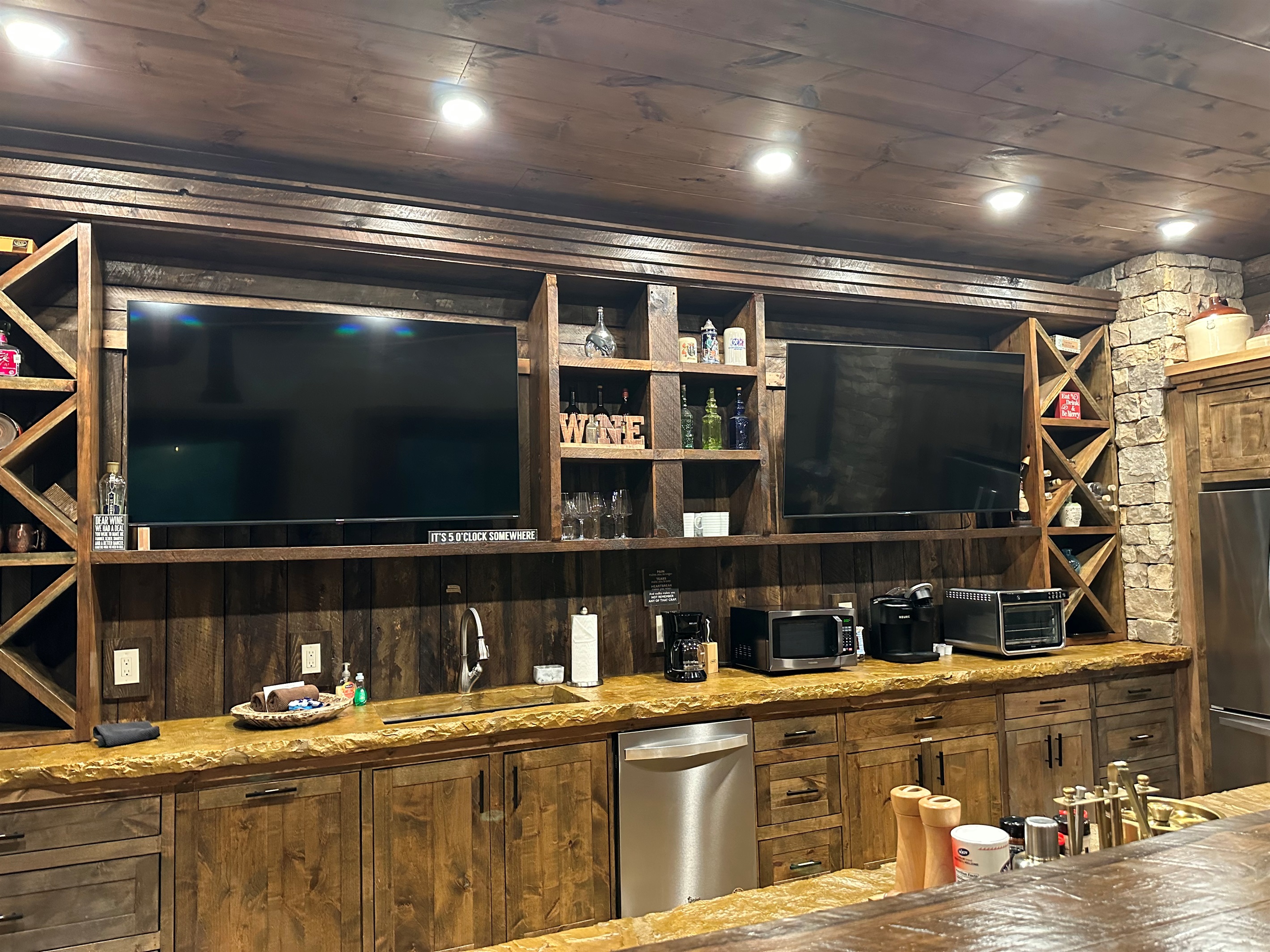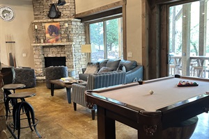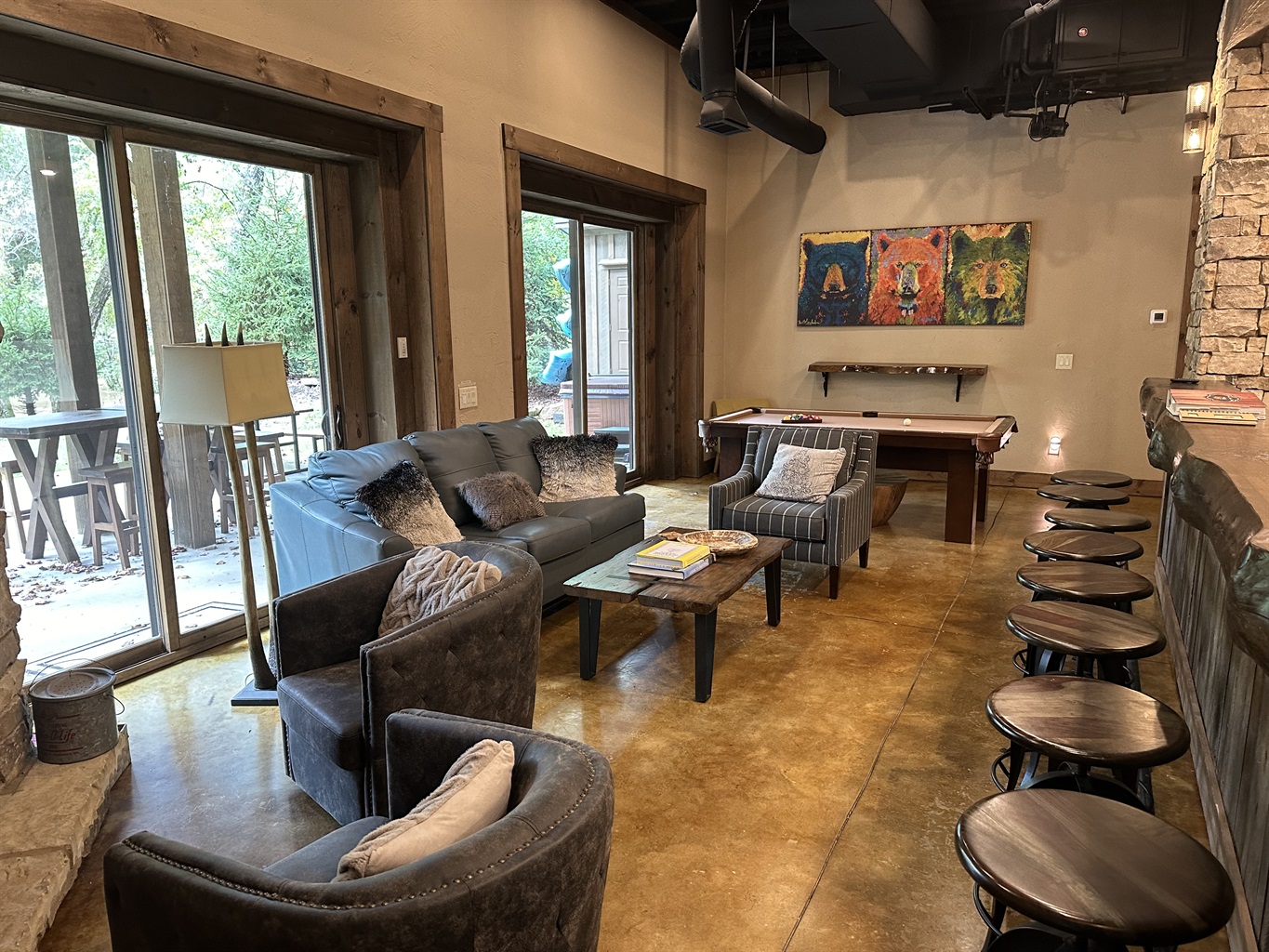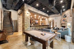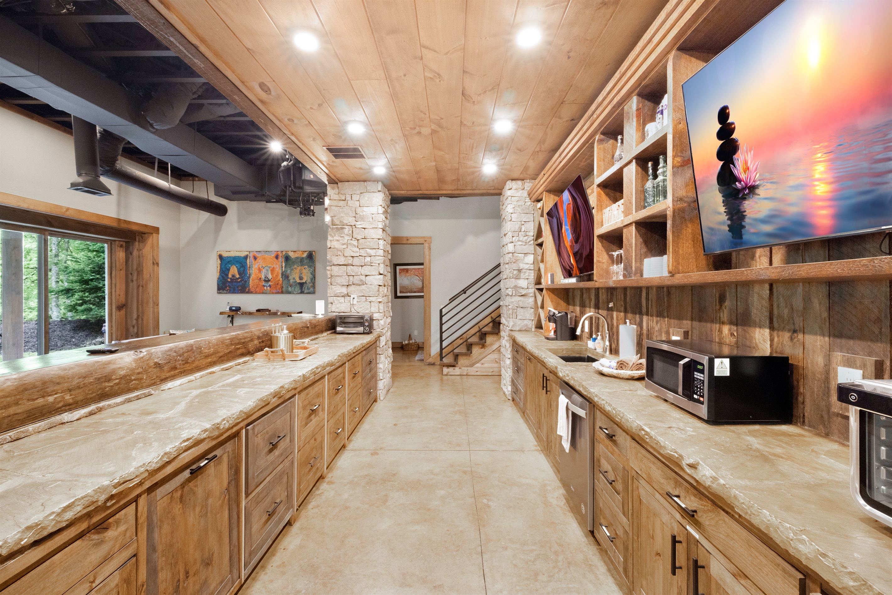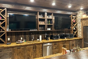 Unwind in the expansive great room, where friends and family can gather around the stacked stone gas fireplace or enjoy movies on two flat-screen TVs. The large bar offers ample seating for 8, perfect for sharing meals or enjoying a cocktail. Our kitchen is equipped with a sink, full-size refrigerator, dishwasher, microwave, cooktop, a Ninja Foodi XL Pro Air Oven, and a crockpot—everything you need to prepare delicious meals.