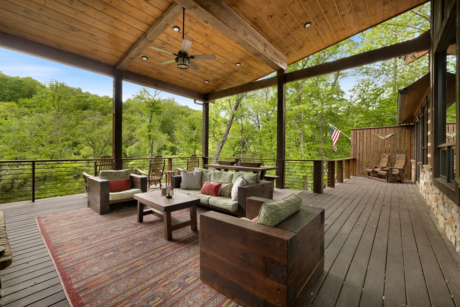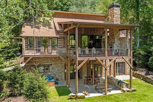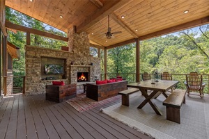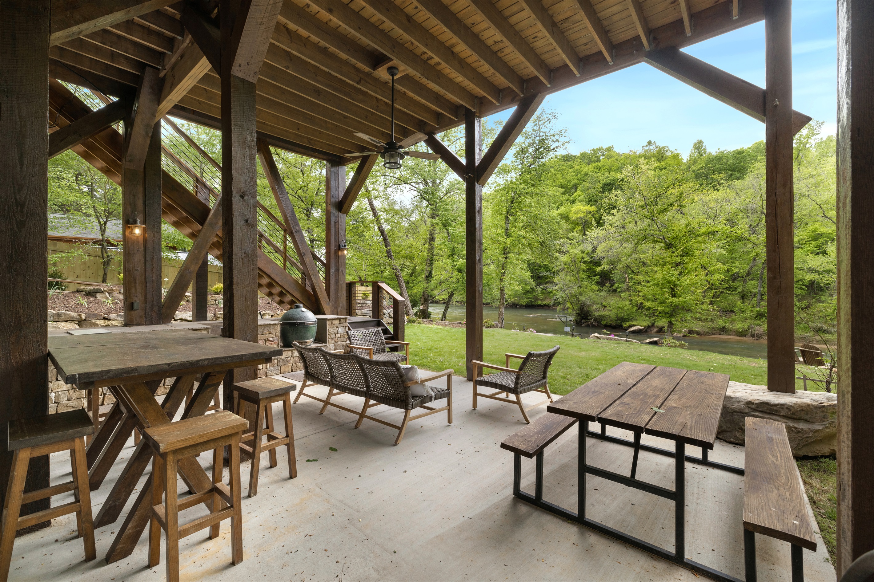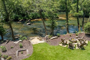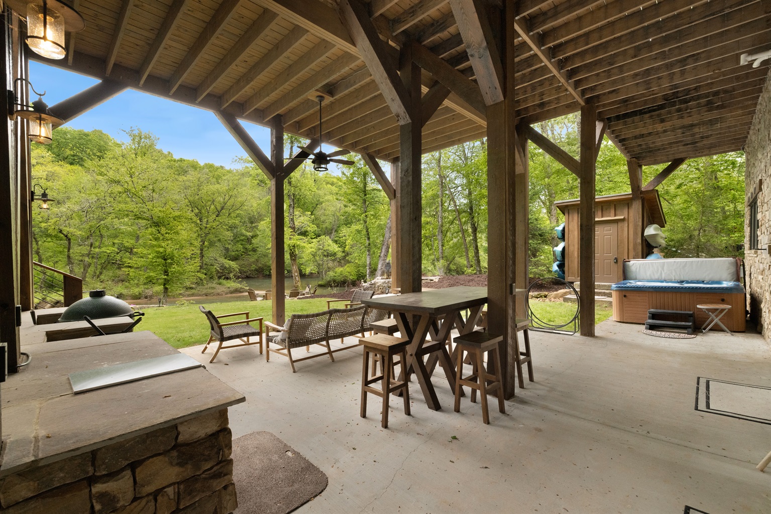 Step outside to experience our outdoor amenities, including a hot tub and a firepit for cozy evenings under the stars after an action packed day of adventure. The covered patio, complete with ample seating and a Green Egg grill, is ideal for barbecuing and alfresco dining while soaking in the natural beauty surrounding you. The anglers in the group will enjoy fishing from the back steps or wading around the island. Others will enjoy a leisurely tube or kayak ride down the river. Guest aslo have access to the upper level deck with fireplace, TV dining table and rocking chairs.