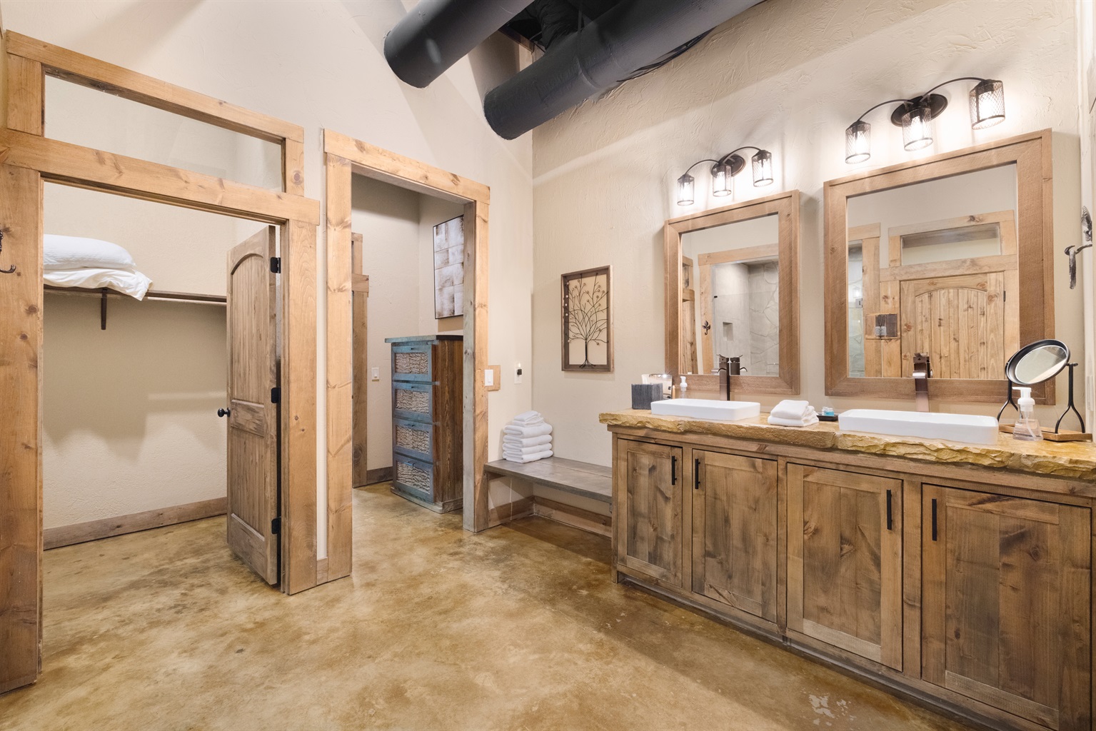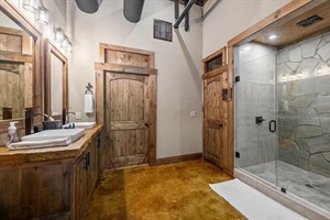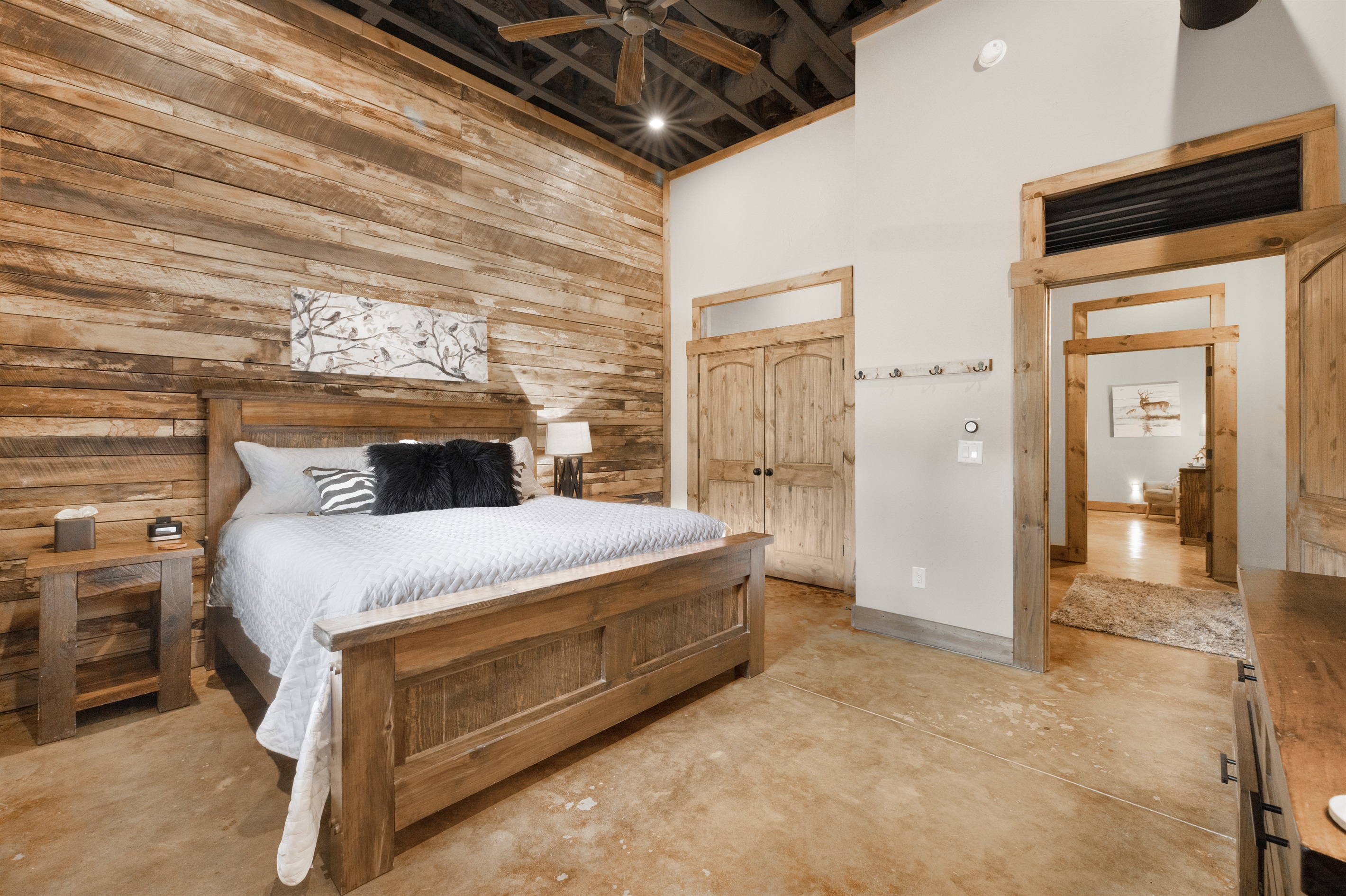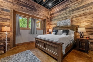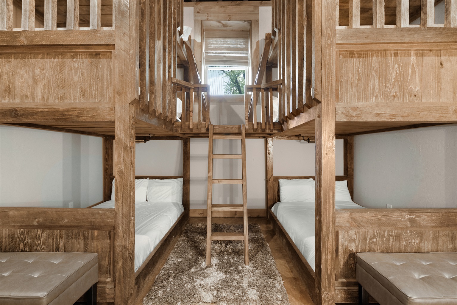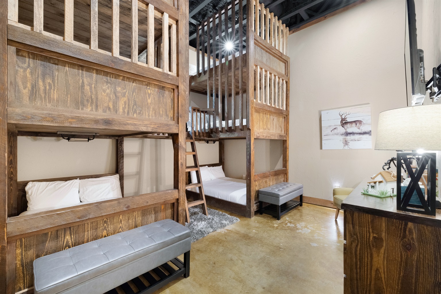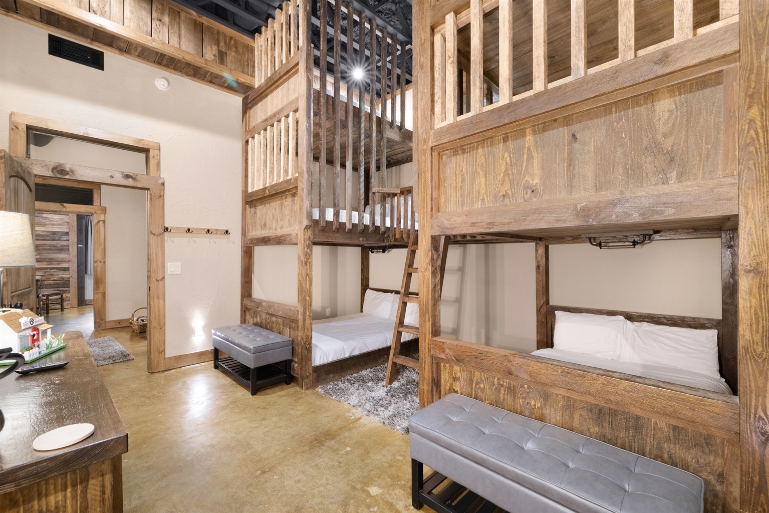 The lower floor features three beautifully appointed bedrooms, including a spacious Master king room with ensuite full bath, a second king room, and a charming bunk room both sharing an additional full bath— ideal for families or groups. Each bedroom is outfitted with plush bedding and a flat-screen TV, ensuring a restful retreat after a day of exploration.